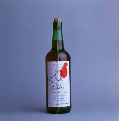 Licor de frutos, de cor vermelho-escura, normalmente com os frutos visíveis.